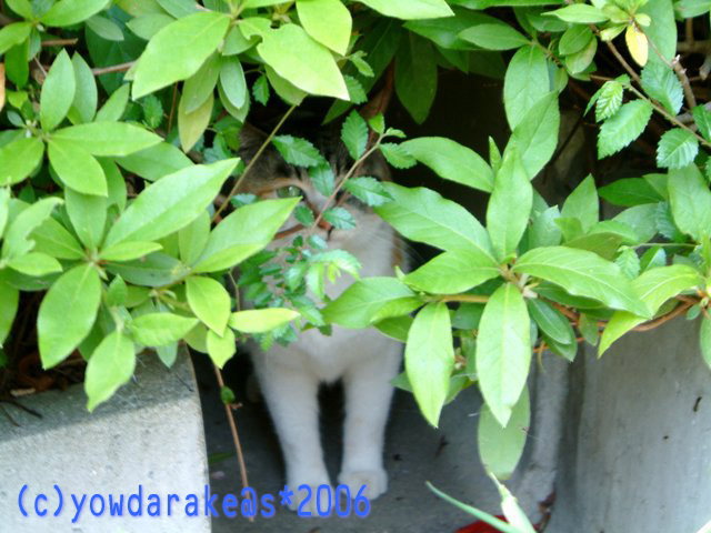 この子は三毛さん。人にビクビク、カメラにビクビク…で隠れてます。
