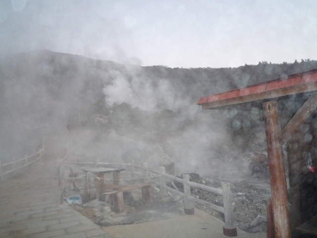 地獄巡り。ゆで卵臭が。湯気が凄くて眼鏡も曇ったり。