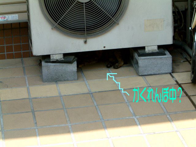 室外機の下の隙間にごろんとサビにゃんこが。